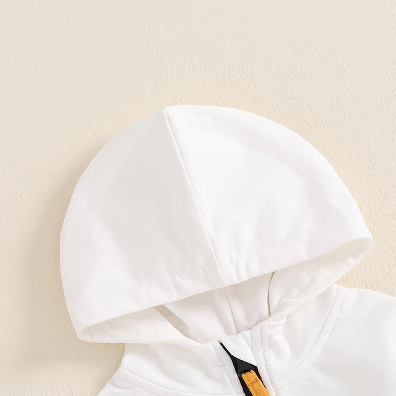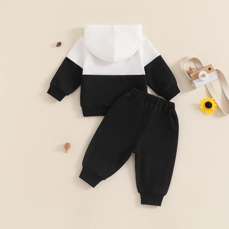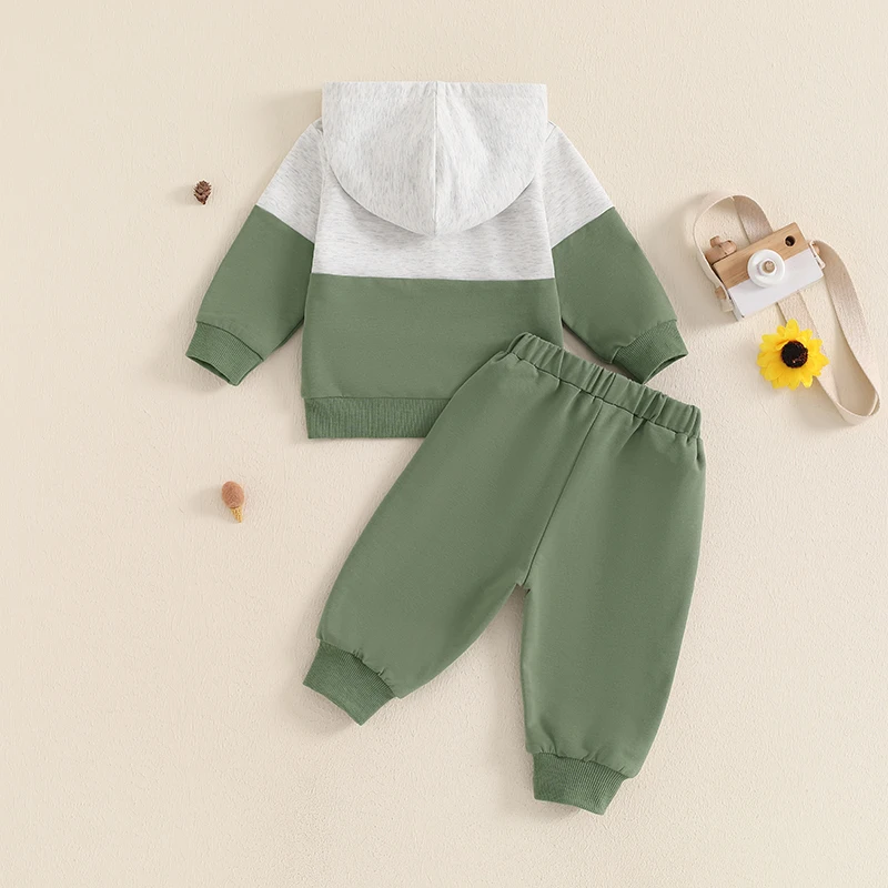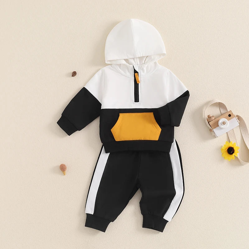Baby boy fall outfit in contrasting colors, warm and cozy. Boys sweatshirt with front pockets, 1/2 zipper, hood and long sleeve design. Baby boy pants with elastic waist design to ensure a comfortable fit, perfect for fall.