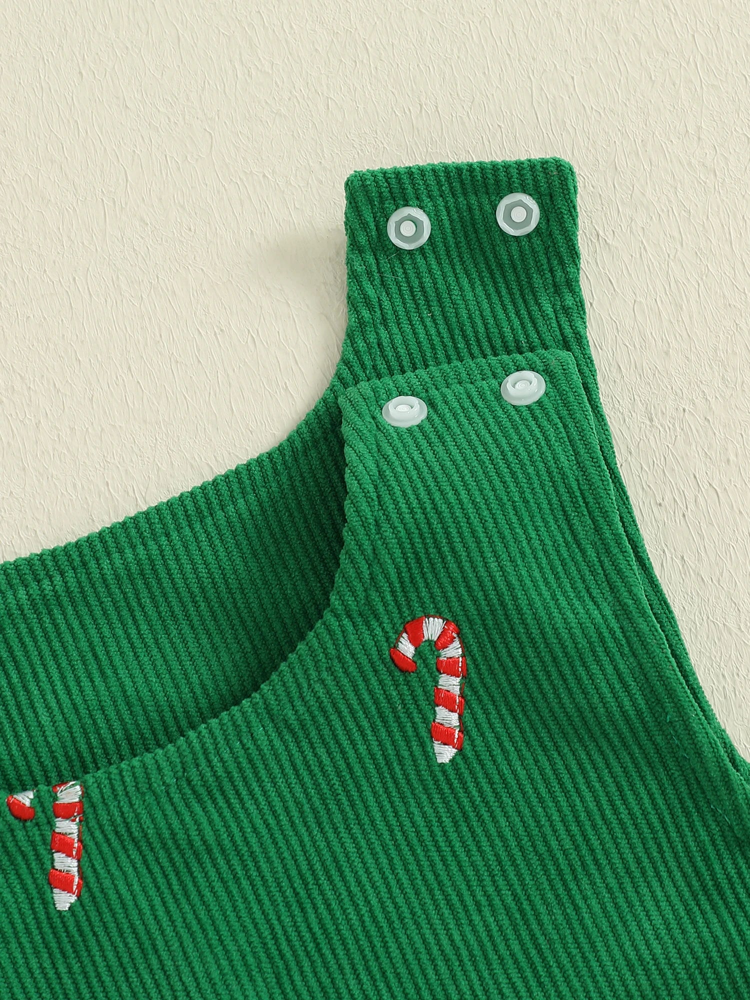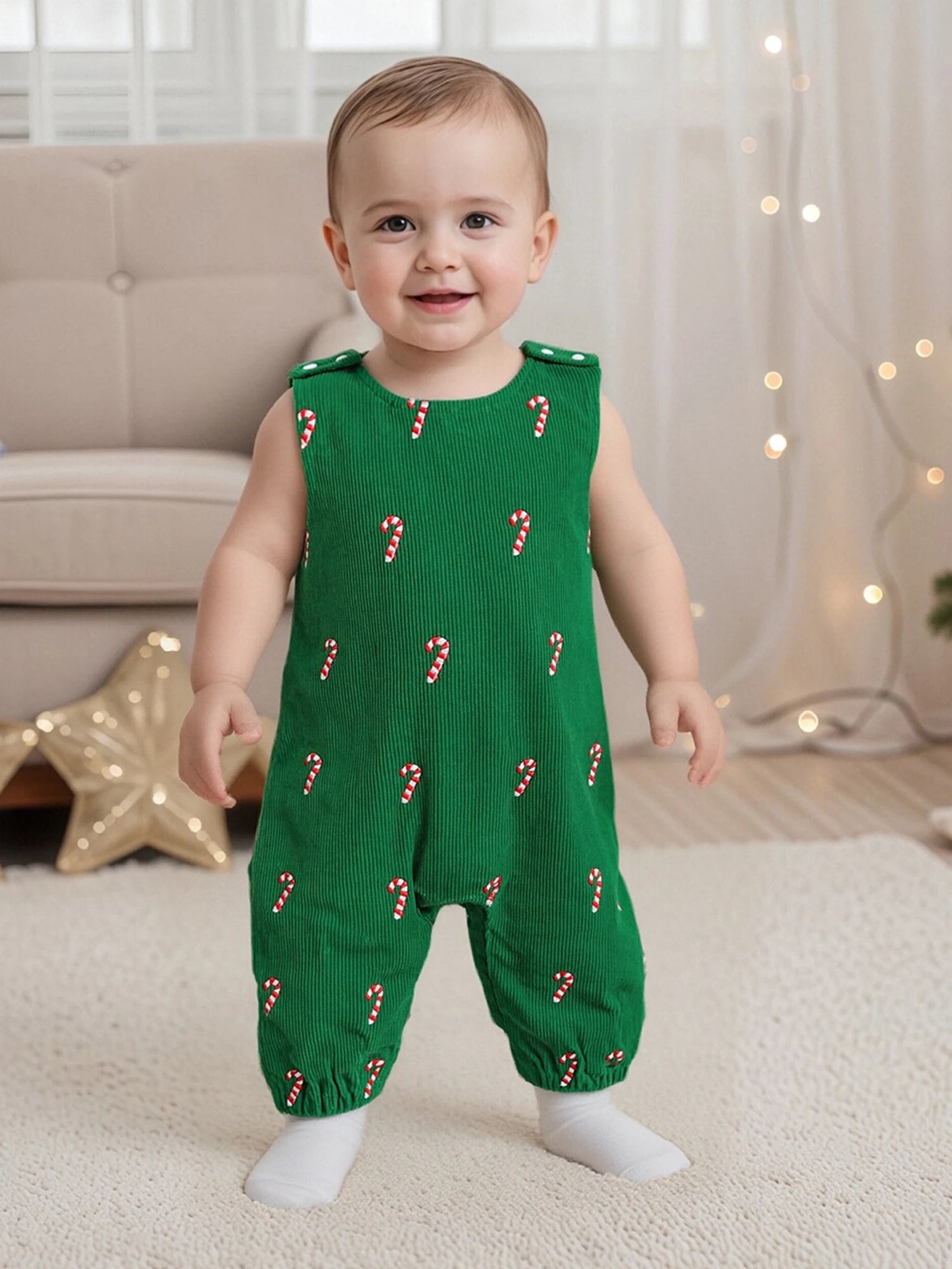 Baby Christmas Romper Sleeveless Round Neck Candy Cane Embroidery Jumpsuit for Boys and Girls