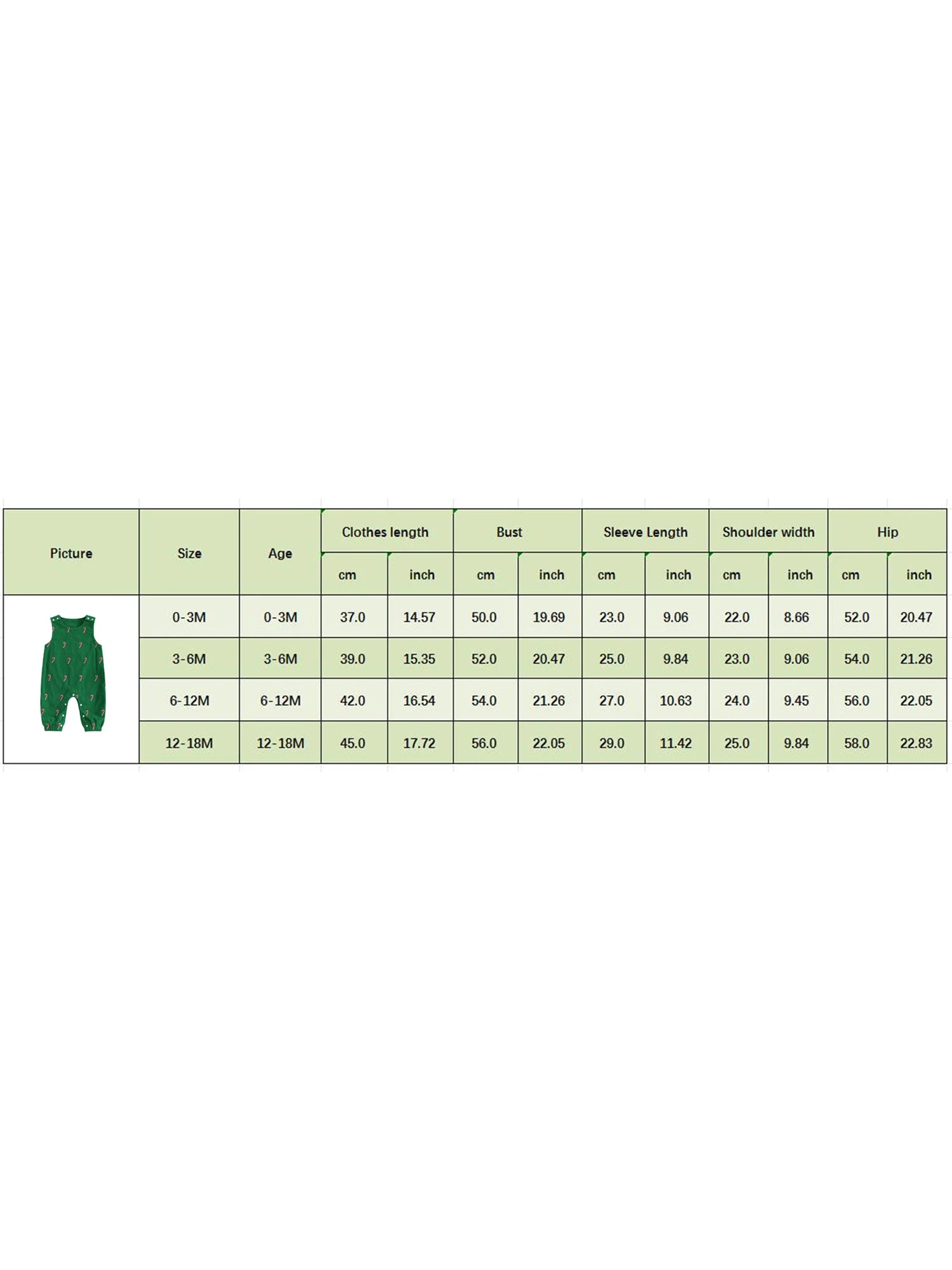 0-3M Length: 19.69 Bust: 20.47 Shoulder: 7.87 Hip: 24.41 Hip Length: 14.57 Advised Age: 0-3 Months