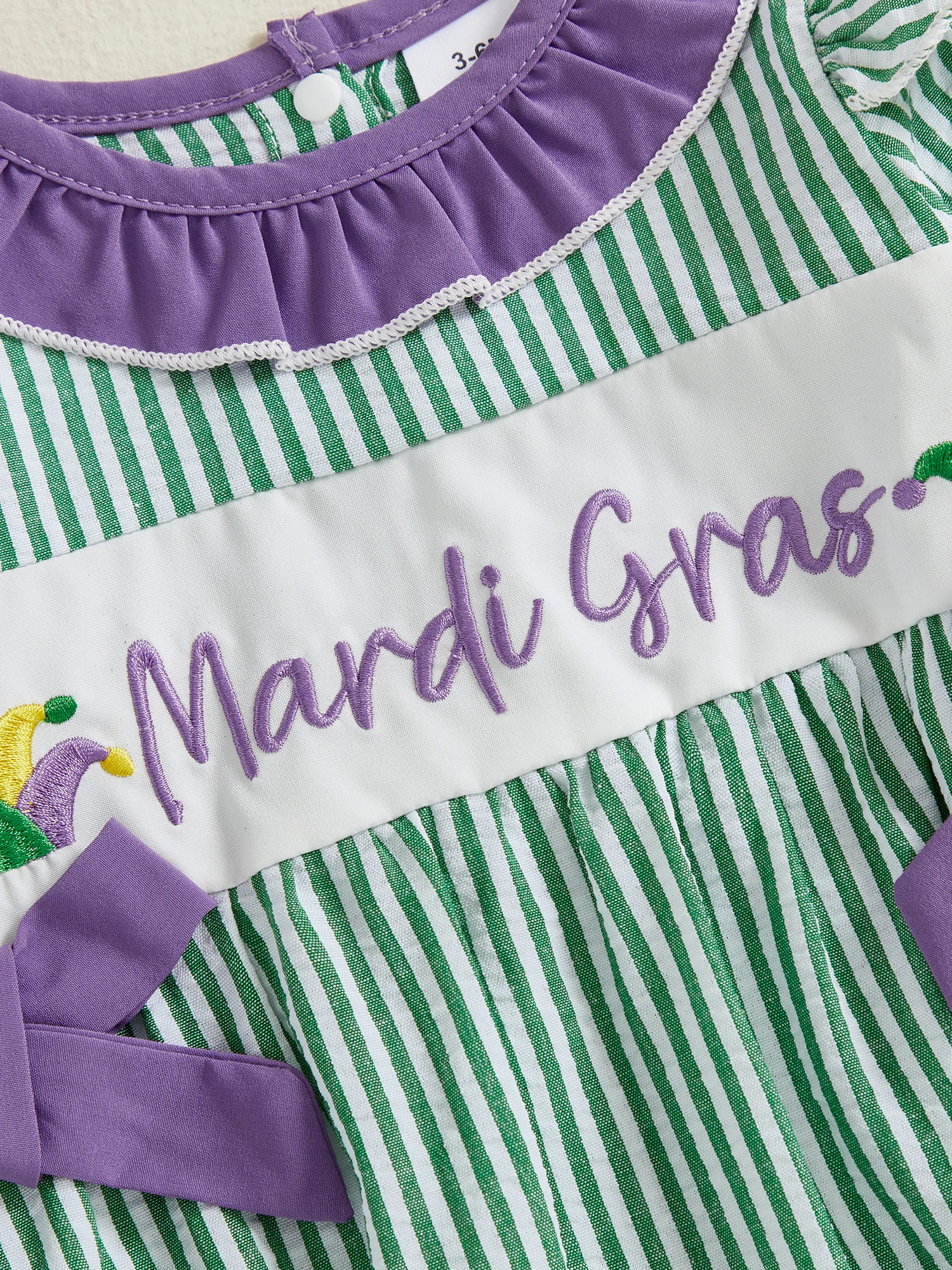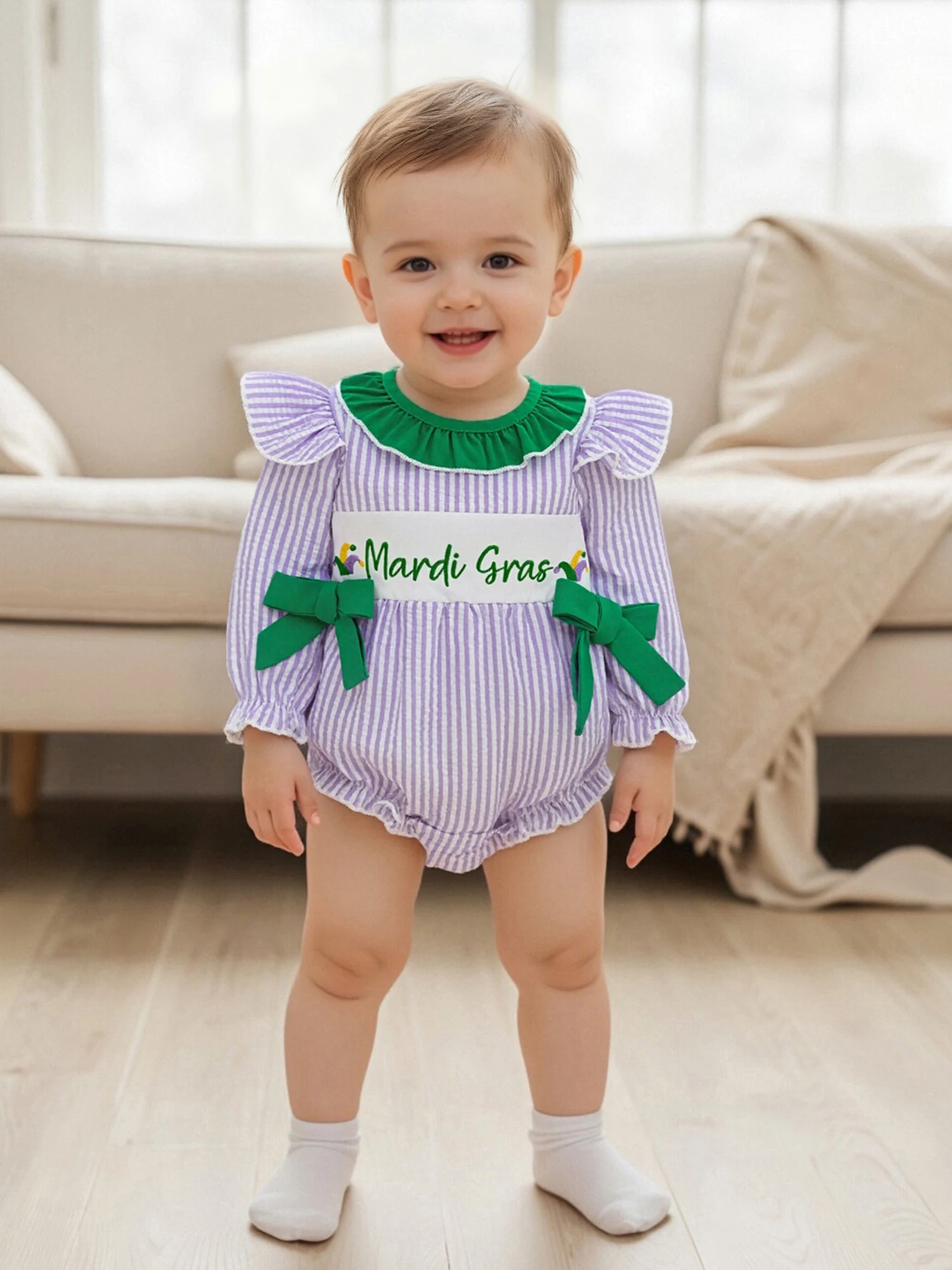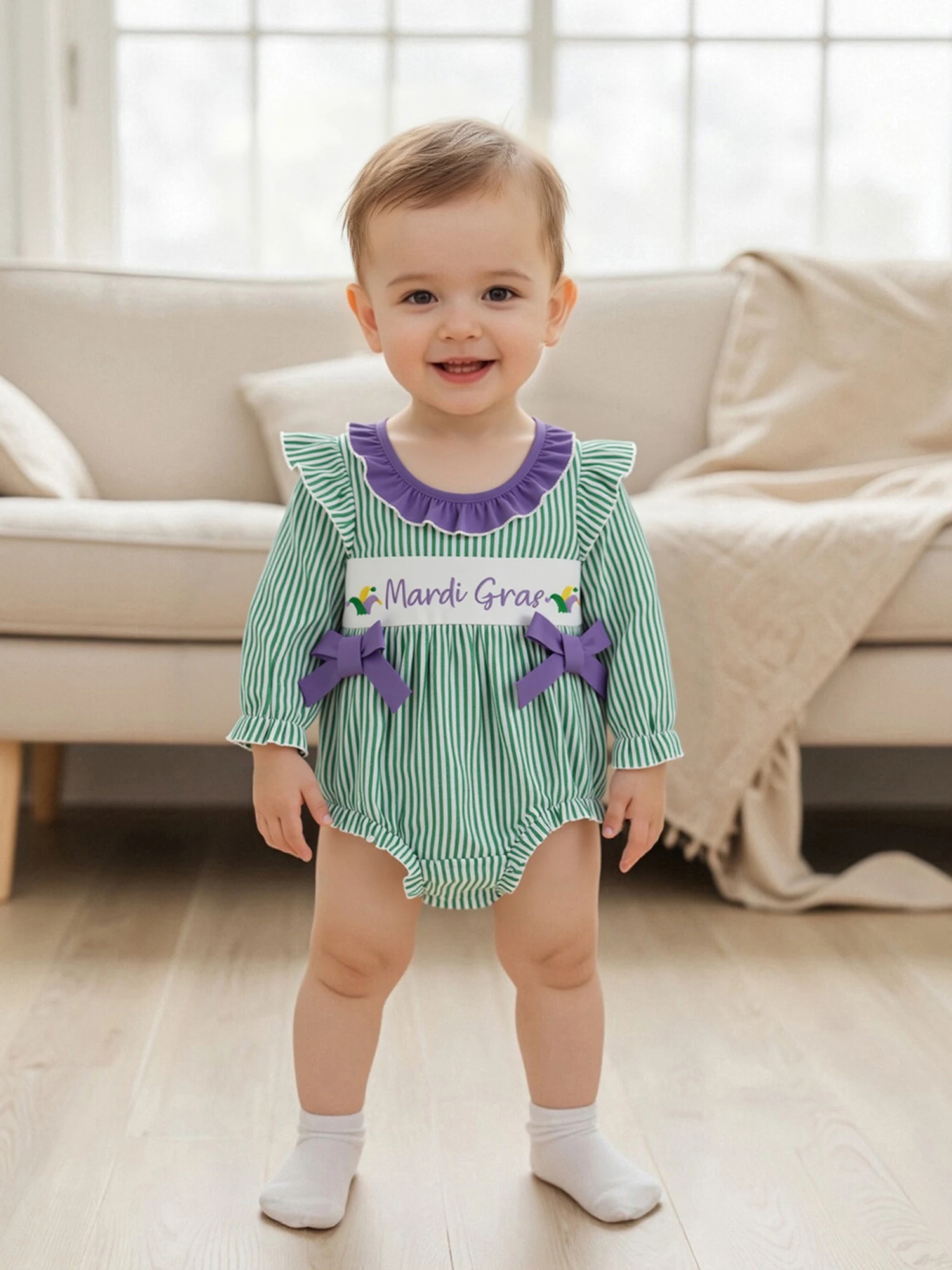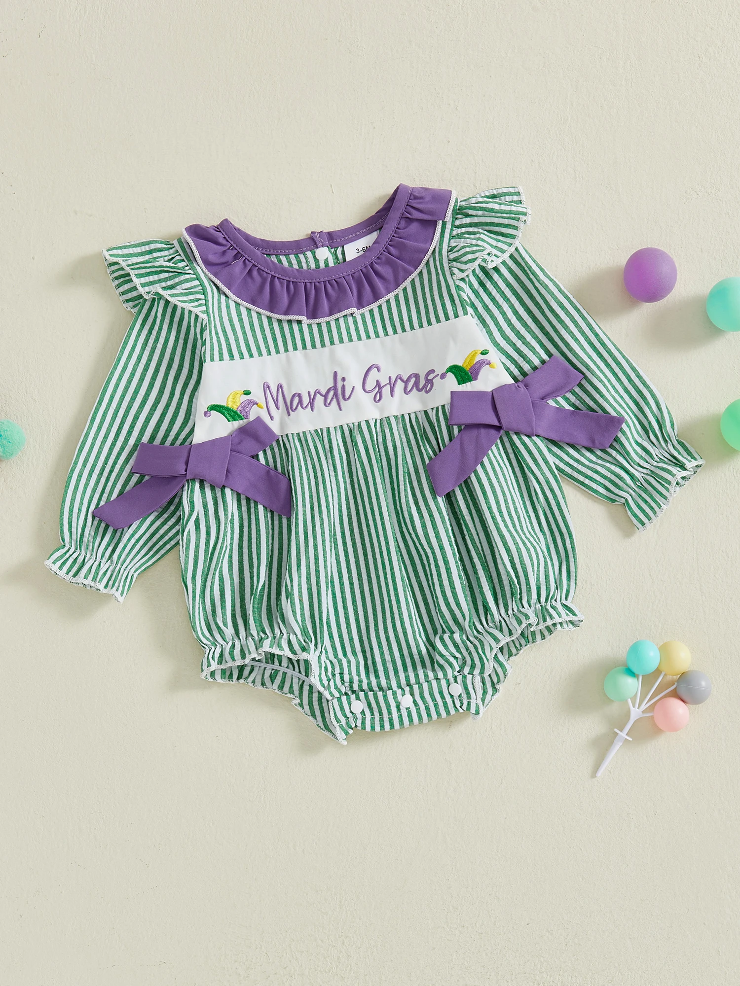 Baby Girls Mardi Gras Bubble Romper Fashionable Cute Mardi Gras Letters Embroidery Long Sleeve Ruffle Jumpsuit