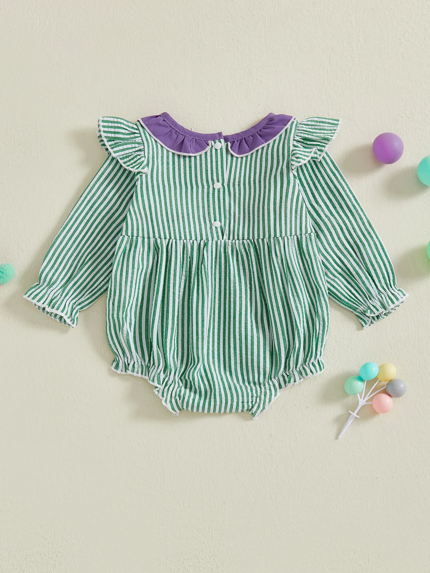 Baby Girls Striped Bubble Romper Fashionable Cute Mardi Gras Letters Embroidery Long Sleeve Ruffle Jumpsuit