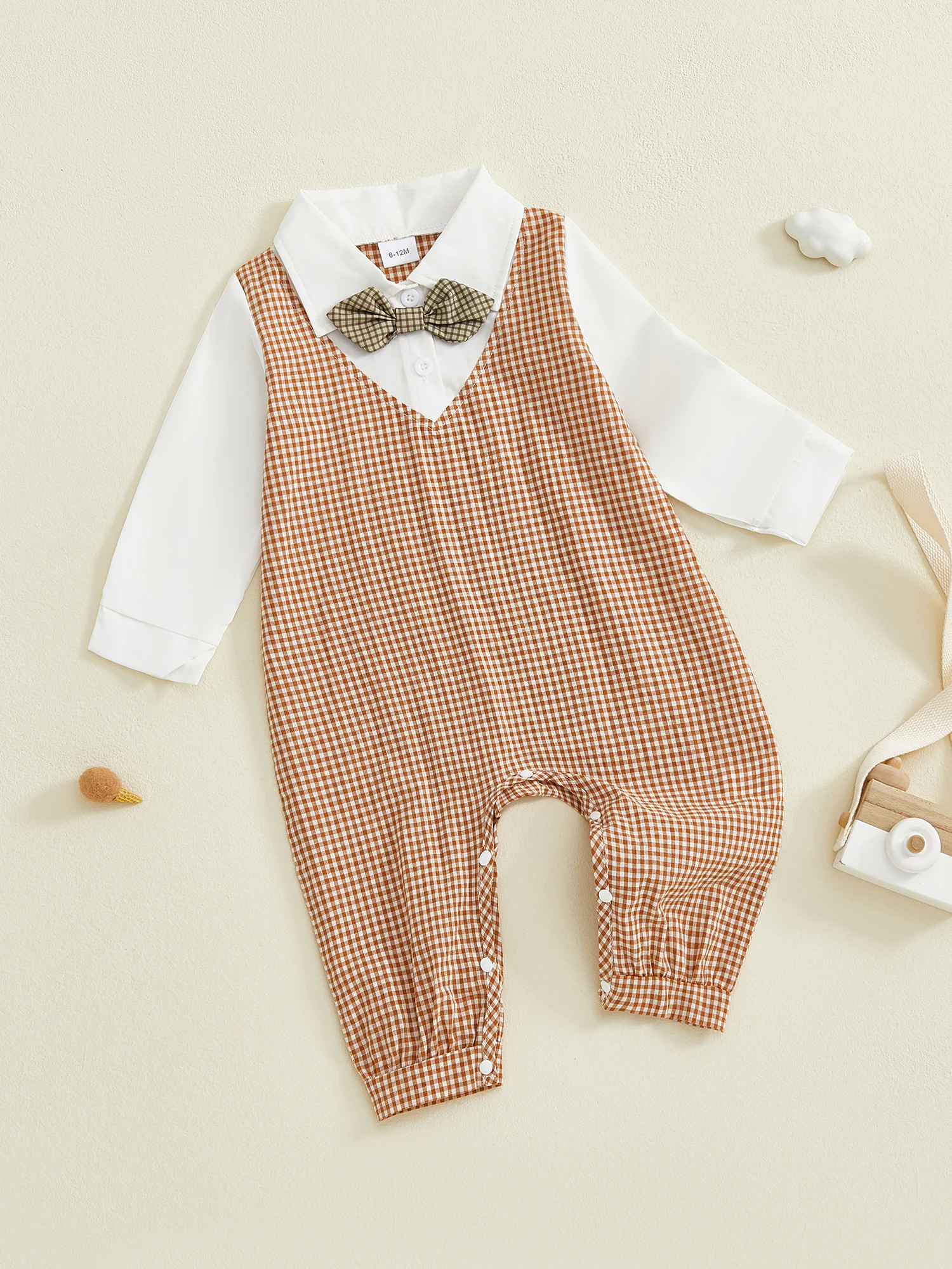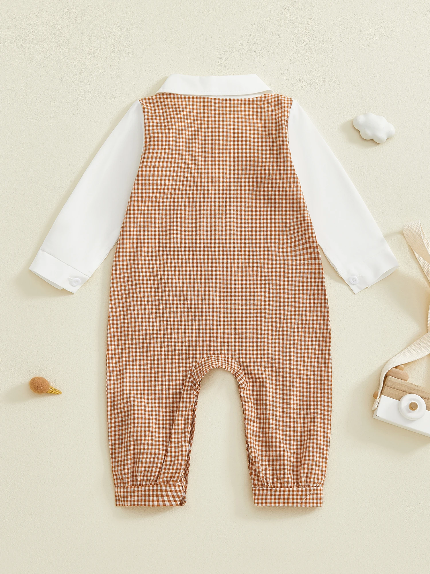 Newborn Baby Boy Romper Gentleman Plaid Print Long Sleeve Turn Down Collar Full Length Jumpsuit