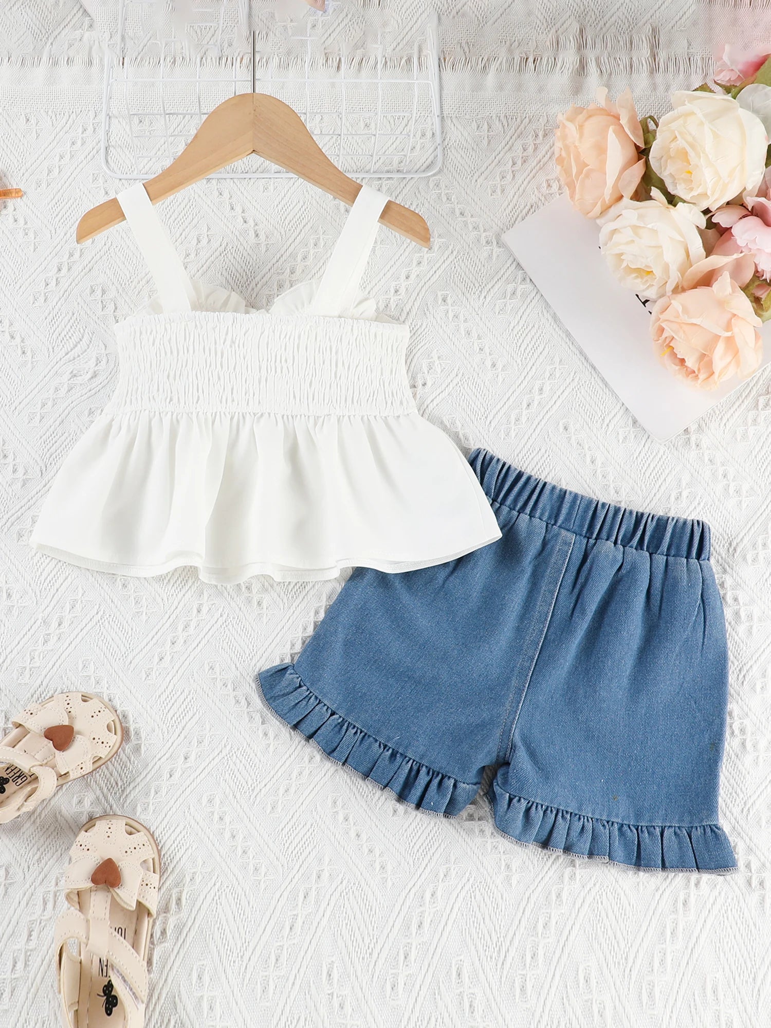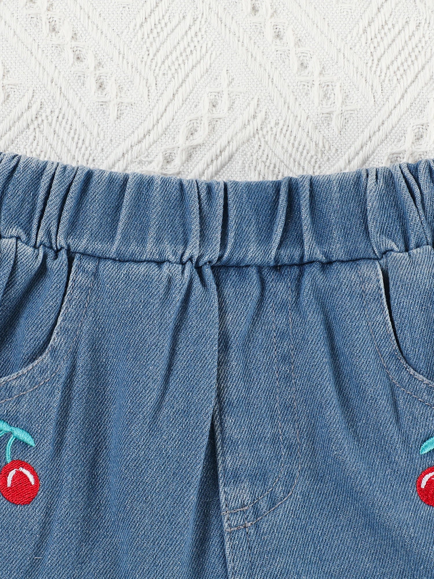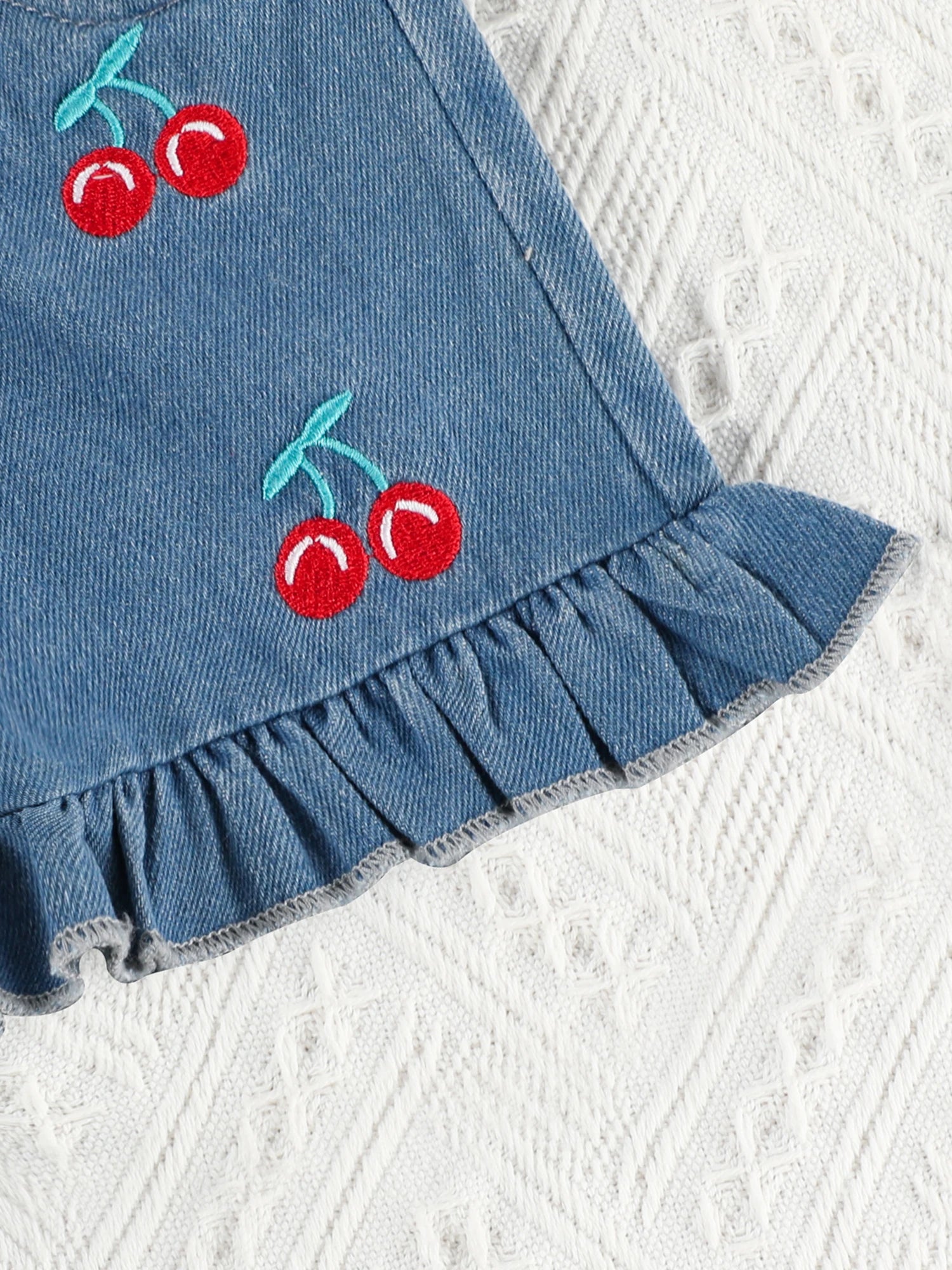 Girls Summer Outfits Bow Sleeveless Camisole and Elastic Cherry Embroidery Denim Shorts Set
