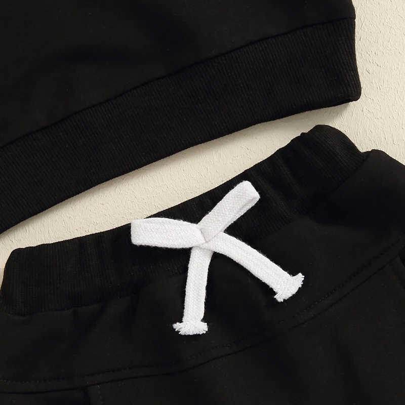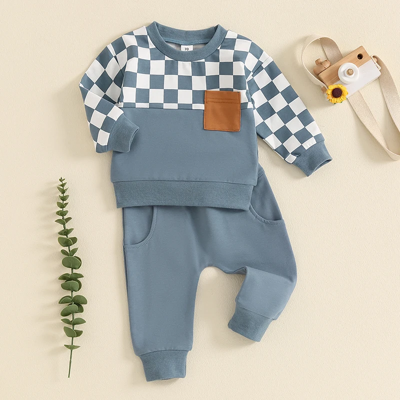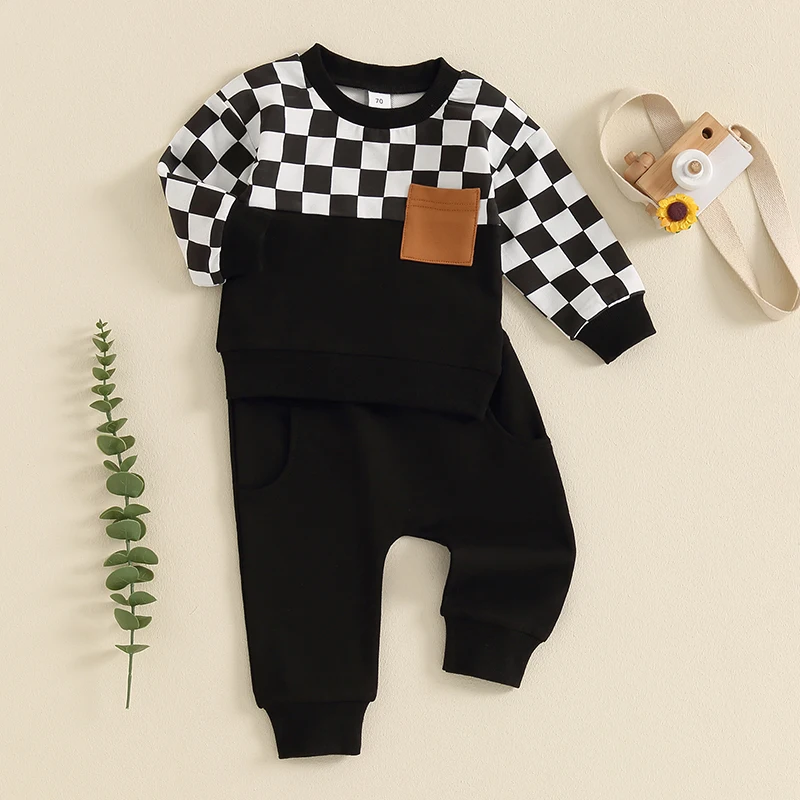 Toddler Boy Fall Clothes Checkerboard Print Long Sleeve Pocket Sweatshirt with Solid Color Pants 2Pcs Outfits